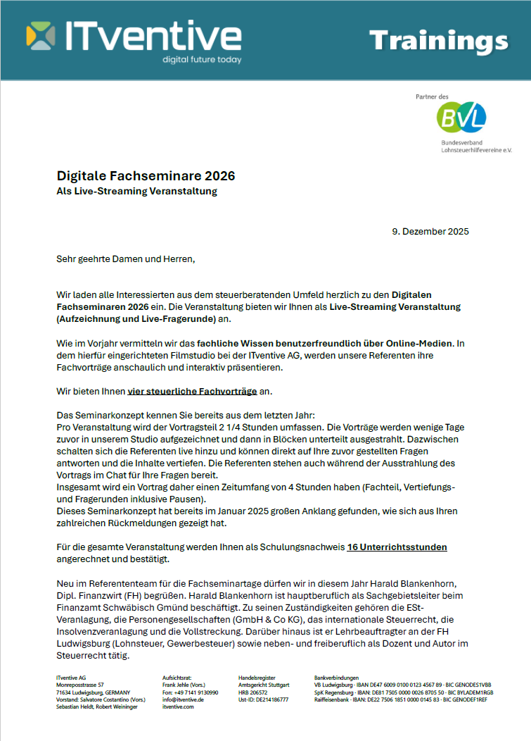 Digitale Fachseminare 2025 – aktuelle Steuerthemen in 4 Tagen mit 4 Referenten